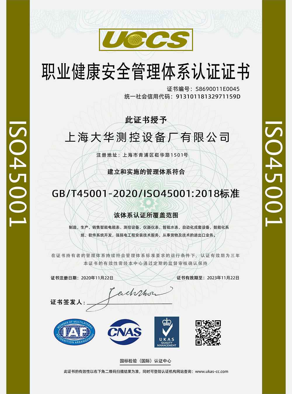 2020年 UCCS职业健康安全管理体系认证证书;